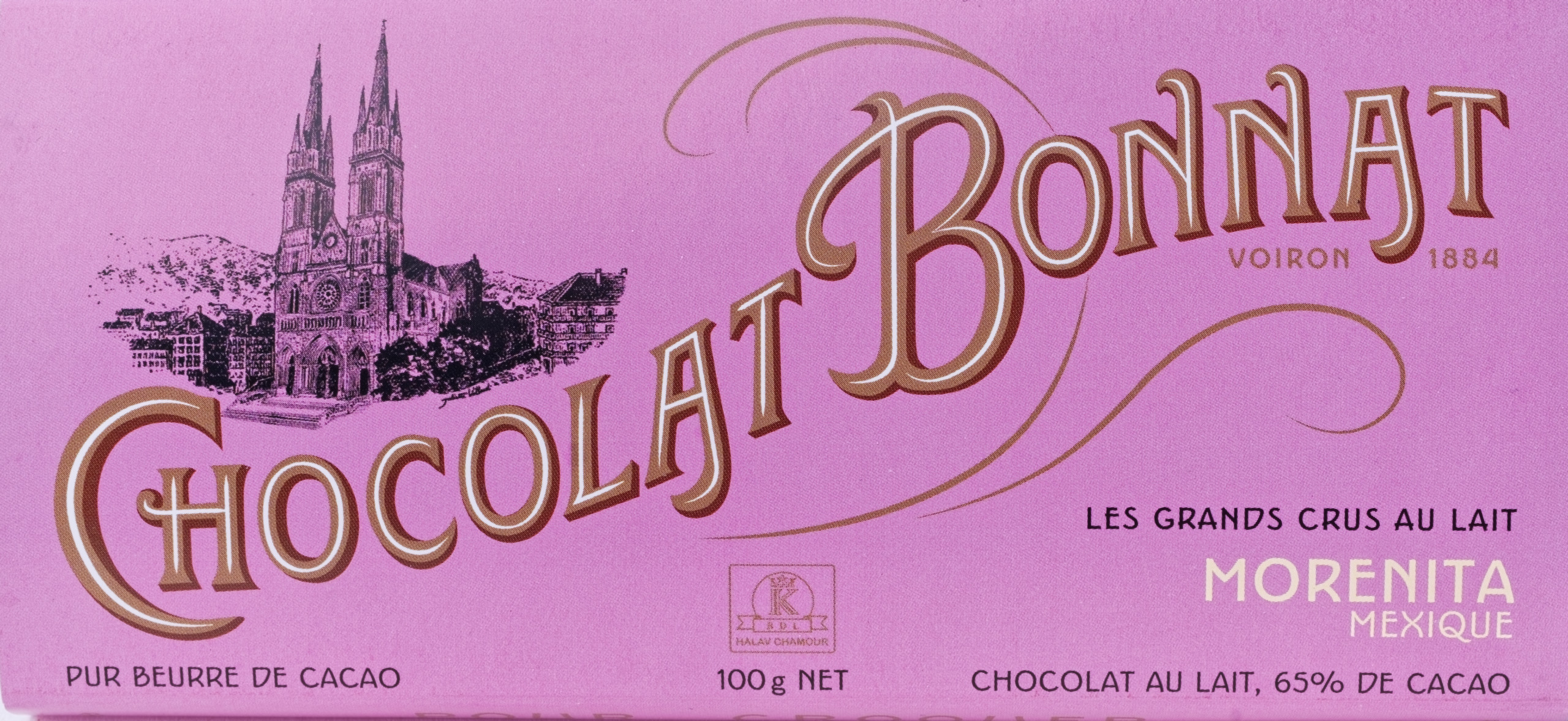 Vollmilchschokolade mit Kakao aus Mexiko mit 65% Kakaoanteil, alkoholfrei, glutenfrei, Tafel, hergestellt von Bonnat.