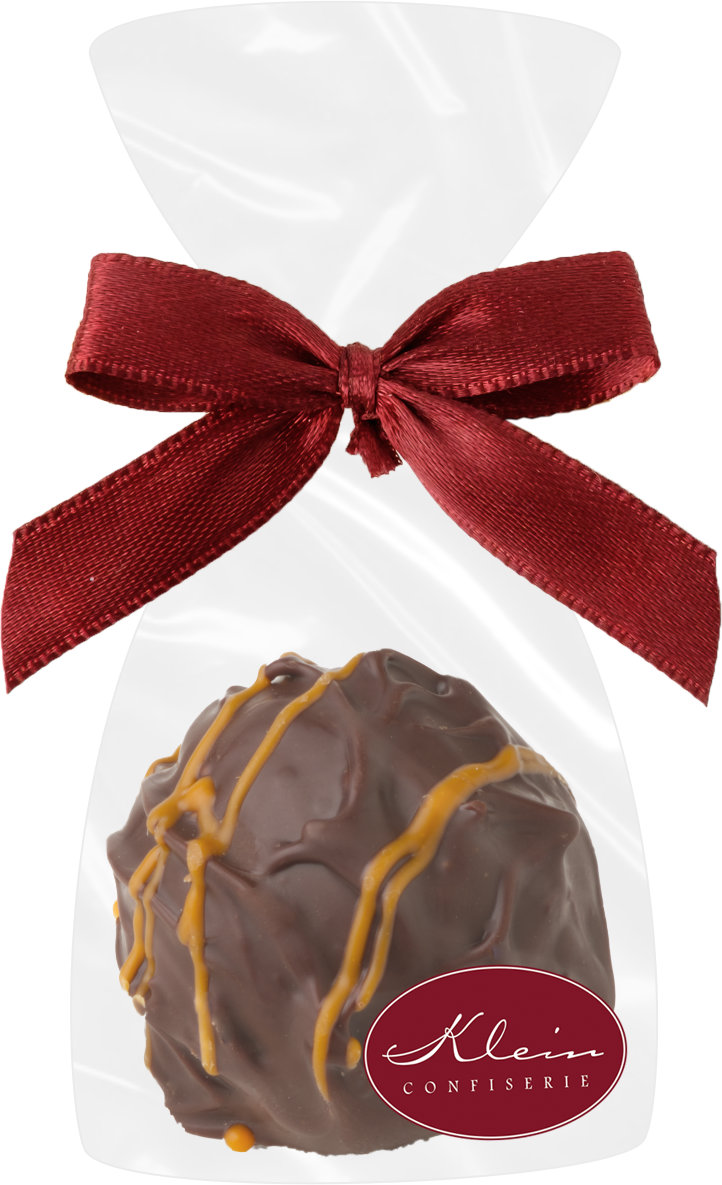 Die Praline wird in eine Klarsichttüte mit dem Logo der Confiserie Klein gegeben und mit einer weinroten Clipschleife verschlossen.
