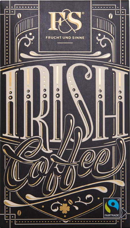Vollmilchschokolade mit 41% Kakaoanteil, gefüllt mit einer Irish-Coffee-Sahnecreme, alkoholhaltig, Schokolade, hergestellt von Frucht & Sinne.