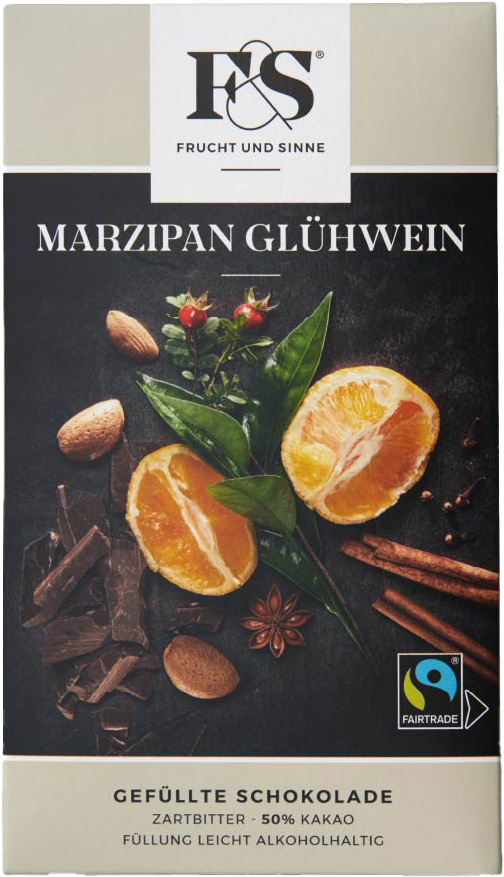Edelherbe Schokolade mit 50% Kakaoanteil, gefüllt mit einer Marzipan-Glühwein-Creme, alkoholhaltig, glutenfrei, Schokolade, hergestellt von Frucht & Sinne.