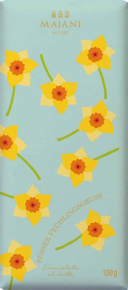 Vollmilchschokolade mit 33% Kakaoanteil, mit Motiv Osterglocken, alkoholfrei, glutenfrei, Tafel, hergestellt von Majani.