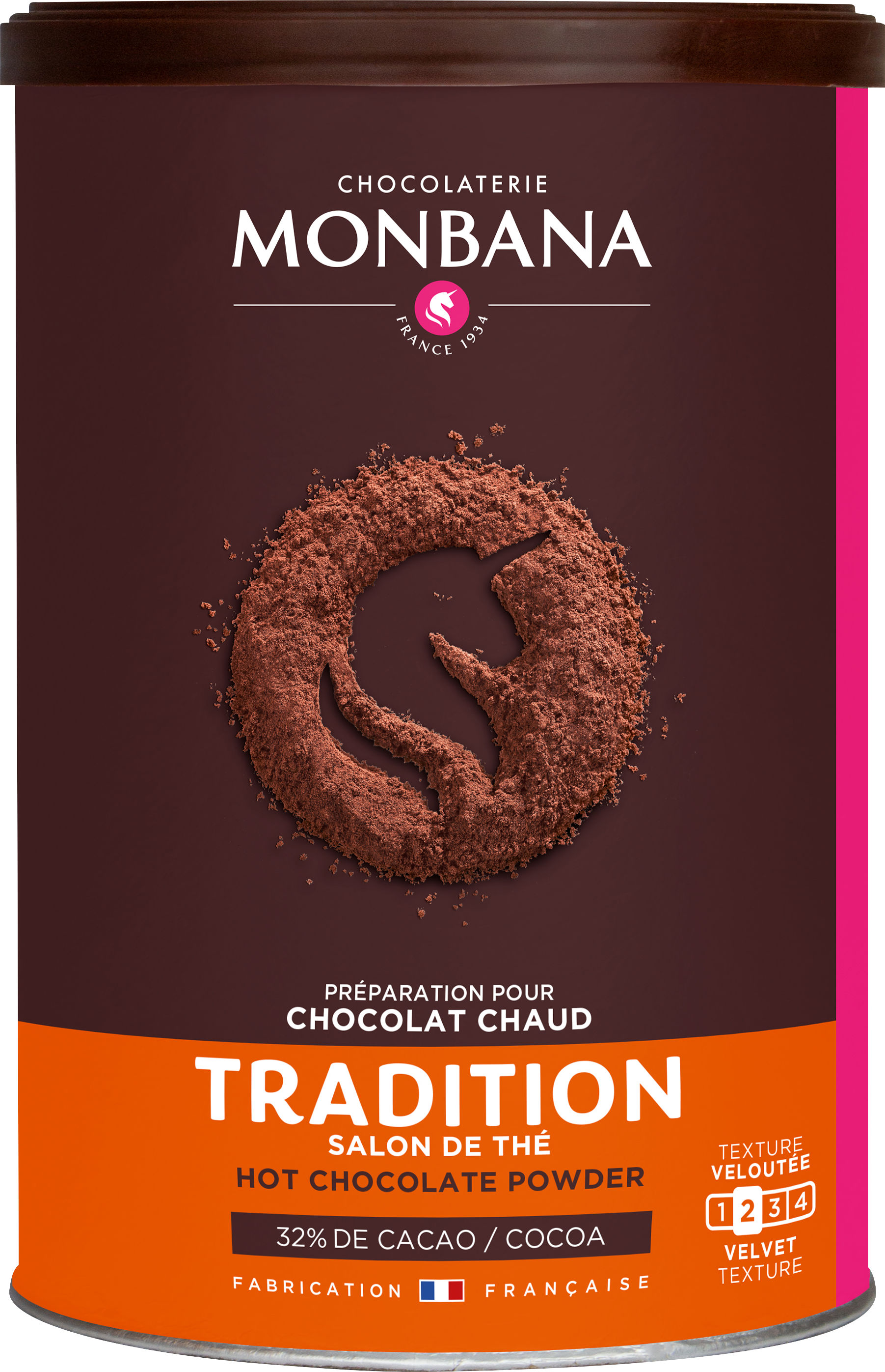 Trinkschokolade mit 32% Kakaoanteil, alkoholfrei, Kakaopulver, hergestellt von Monbana.