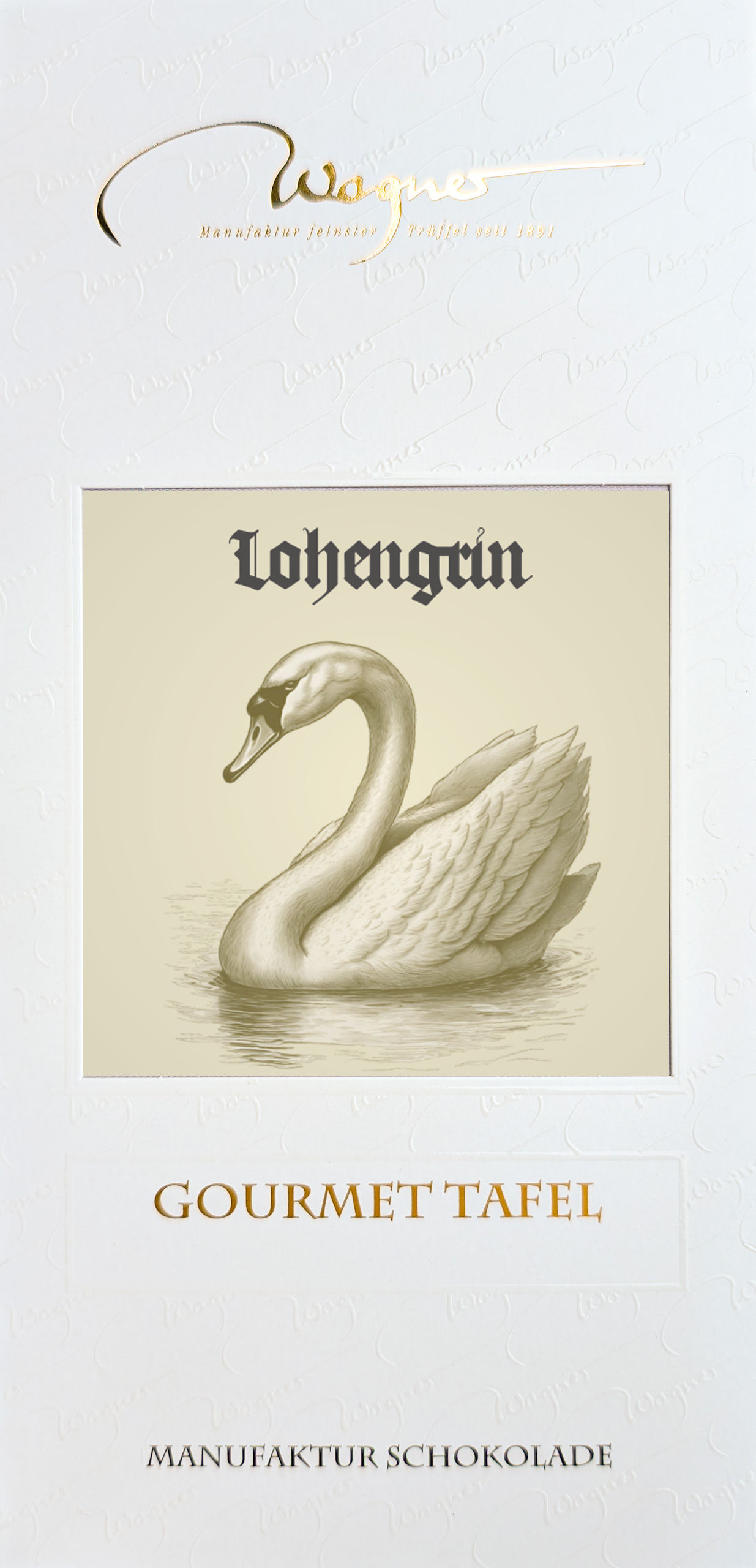 Edelherbe Schokolade mit Kakao aus Ecuador mit 71% Kakaoanteil, mit Motiv der Richard-Wagner-Oper Lohengrin, alkoholfrei, Tafel, hergestellt von Wagner.