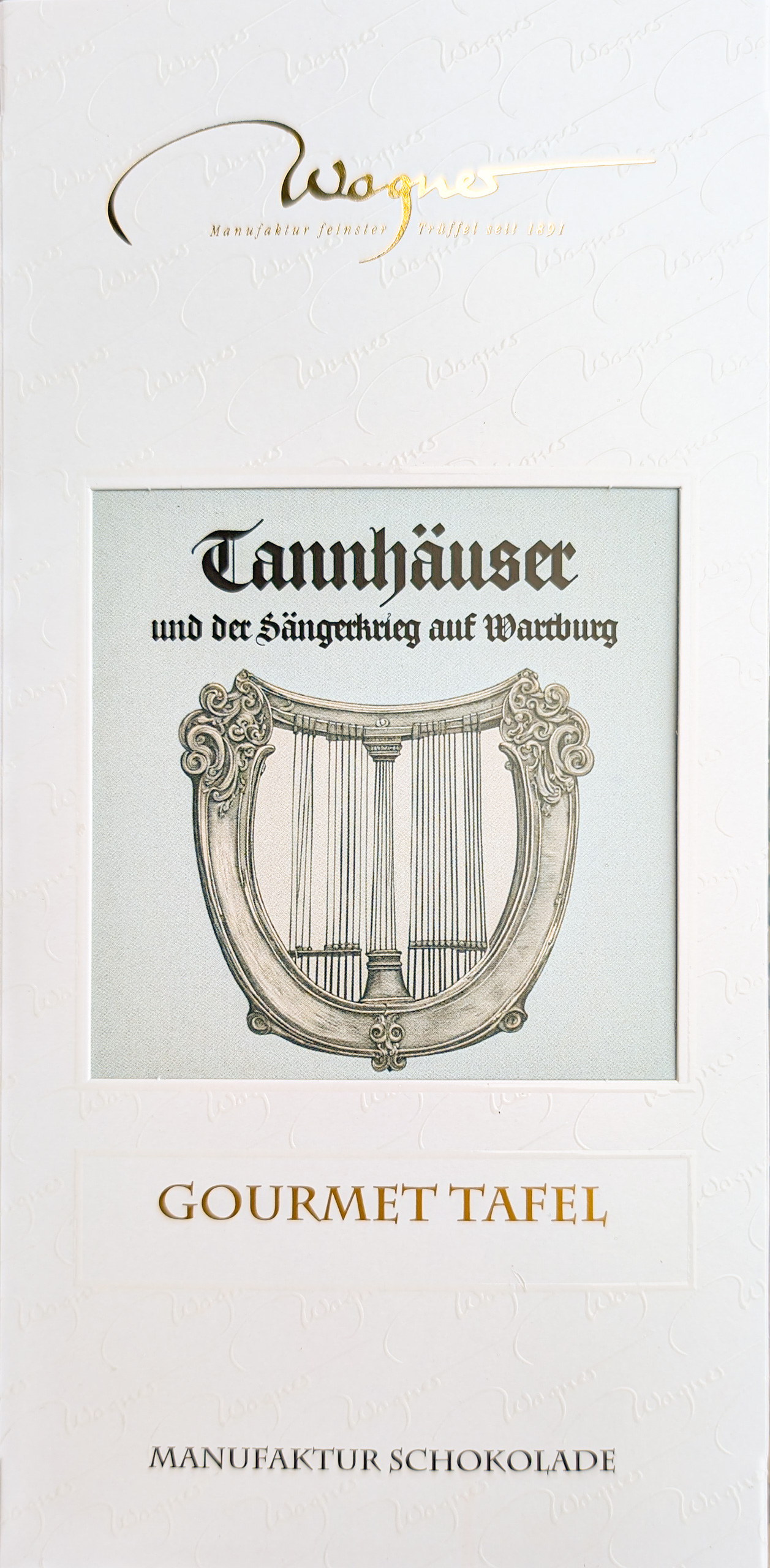 Edelherbe Schokolade mit Kakao aus Ecuador mit 71% Kakaoanteil, mit Motiv der Richard-Wagner-Oper Tannhäuser, alkoholfrei, Tafel, hergestellt von Wagner.