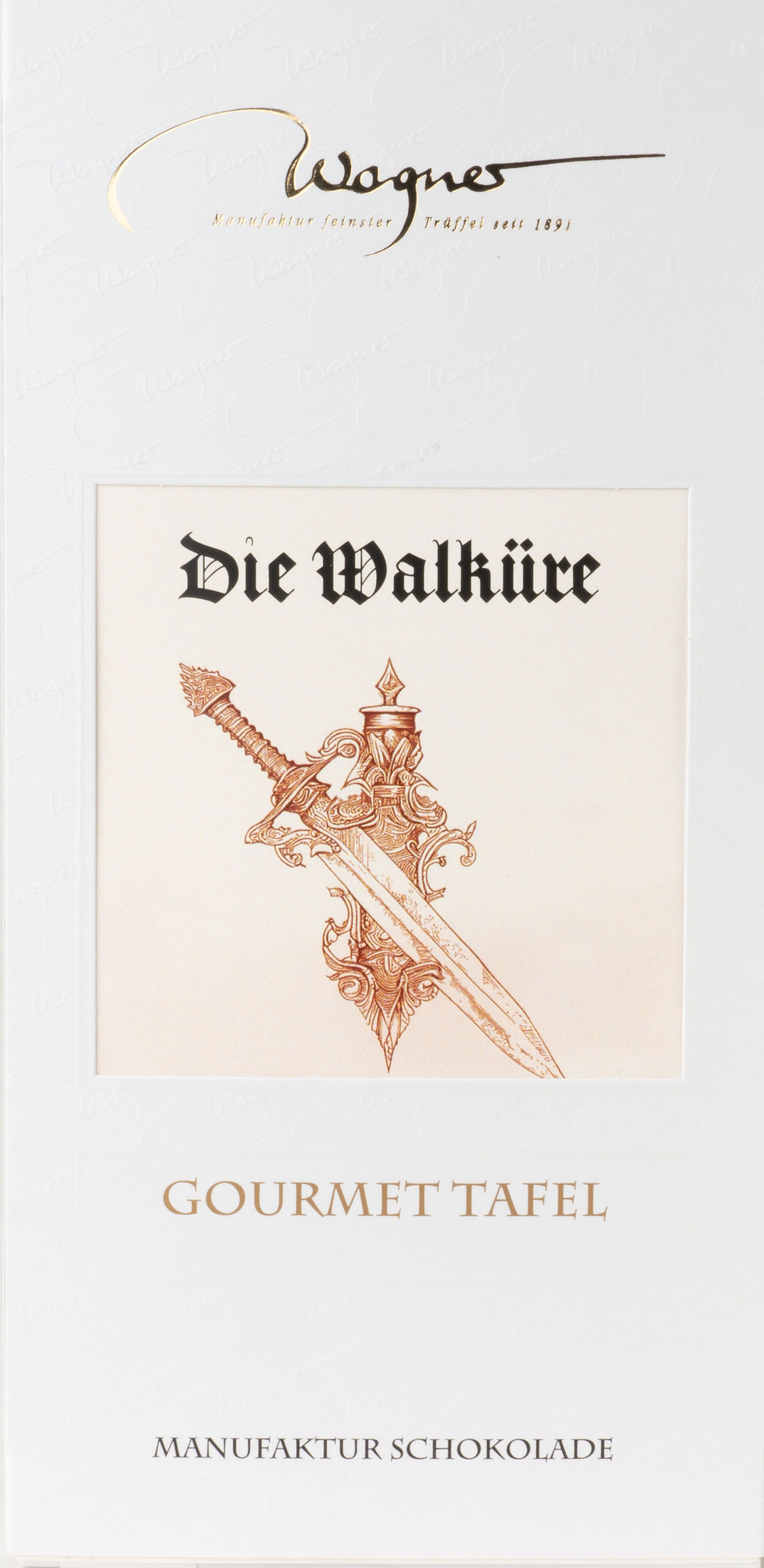 Edelherbe Schokolade mit 71% Kakaoanteil, weiße Schokolade mit 30% Kakaoanteil, mit Karamellcrisp, mit Motiv der Richard-Wagner-Oper Walküre, alkoholfrei, Tafel, hergestellt von Wagner.